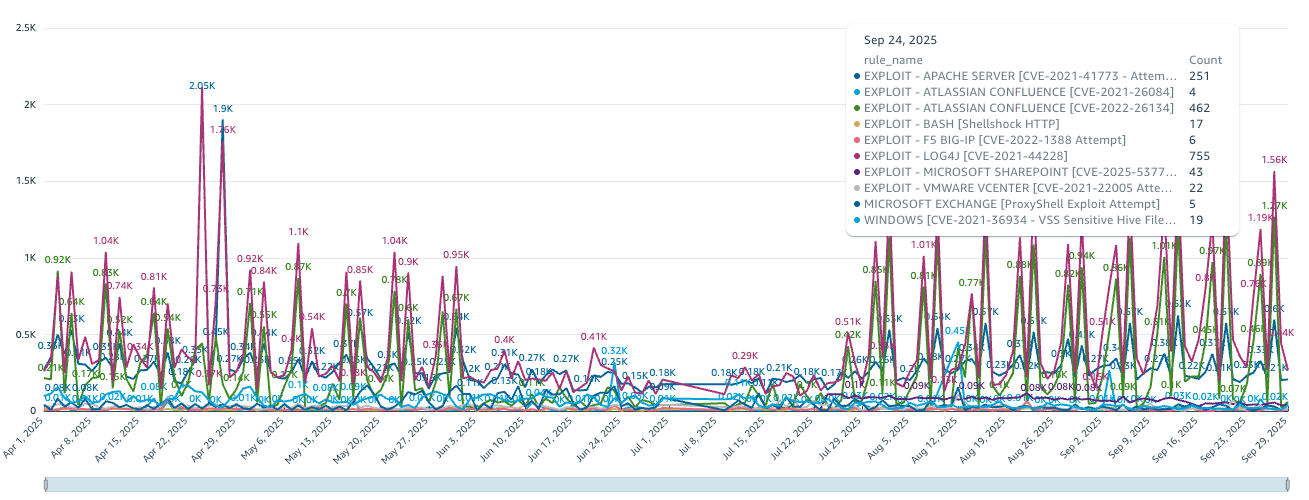 The daily trend data for CVE exploitation attempts from April to September 2025 reveals a pattern of intense activity with notable peaks and valleys. The overall volume of mass exploitation campaigns declined significantly after the second quarter, consistent with the general 69% detection decline from April to September 2025. Analysis of our daily telemetry reveals a significant spike in exploitation attempts in late April, driven primarily by attacks targeting a legacy Apache HTTP Server vulnerability (CVE-2021-41773) and an Atlassian Confluence vulnerability (CVE-2021-26084).
