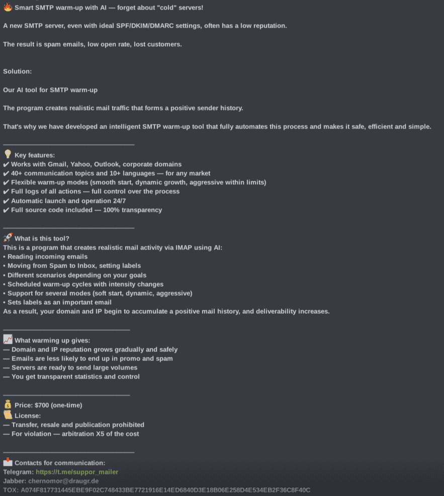 The commercialization of AI-enhanced SMTP warming tools represents a democratization of advanced email threat capabilities. At $700 USD for a one-time purchase with full source code included, this tool makes sophisticated email reputation manipulation accessible to a broader range of threat actors who may lack the technical expertise to develop such capabilities independently. The inclusion of Python-based source code is particularly concerning as it enables further customization and potentially the development of derivative malicious tools with enhanced capabilities.