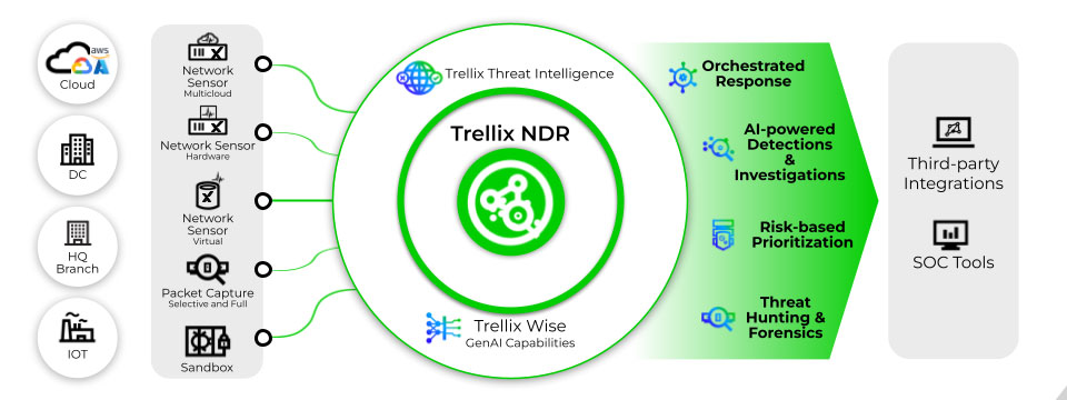Trellix NDR continuously monitors both north-south and east-west traffic across the perimeter and edge networks to detect and respond to threats, using machine learning and behavioral analytics to identify malicious and anomalous activities across cloud, hybrid, and on-premises environments. Such activities might be missed by traditional security tools such as next-generation firewalls, IPS, SSEs, and other systems.