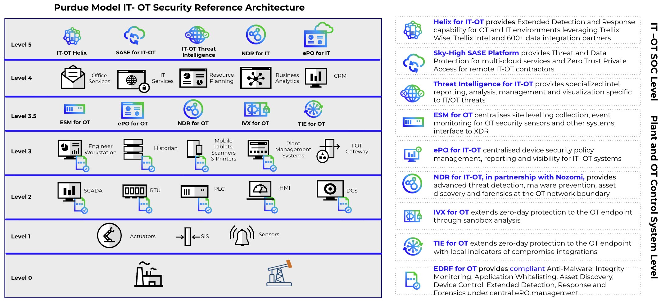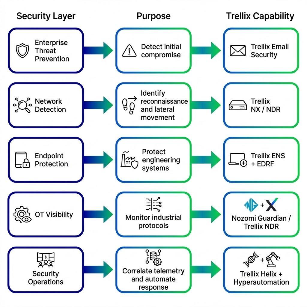 Figure 1 below illustrates how Trellix capabilities map to key security layers and support detection, protection, and response across industrial environments.