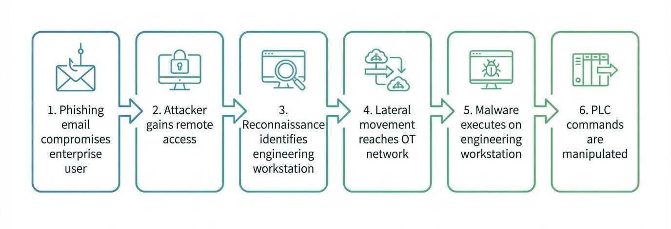 Most attacks targeting operational technology environments don’t begin inside OT networks. Instead, attackers typically compromise enterprise IT systems first and then move laterally toward engineering workstations and industrial control systems.
