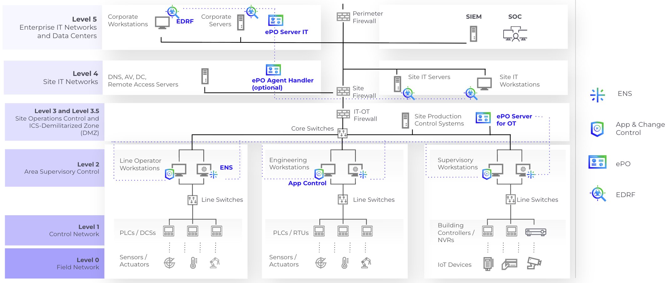 This architecture reflects how attacks move from enterprise IT into OT environments and how Trellix solutions disrupt this path.