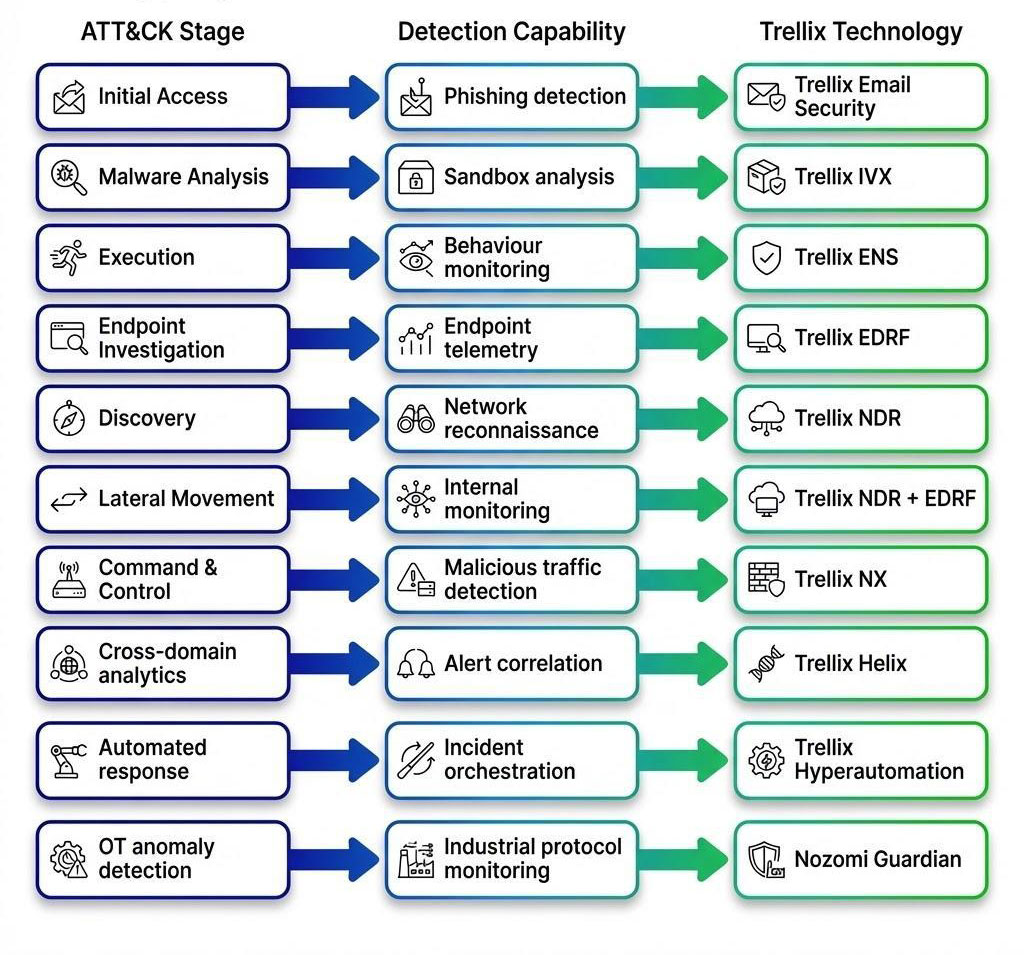 The Trellix platform enables this approach by providing integrated visibility, detection, and response across both IT and OT environments, supporting security teams in identifying and disrupting attacks across the full lifecycle.