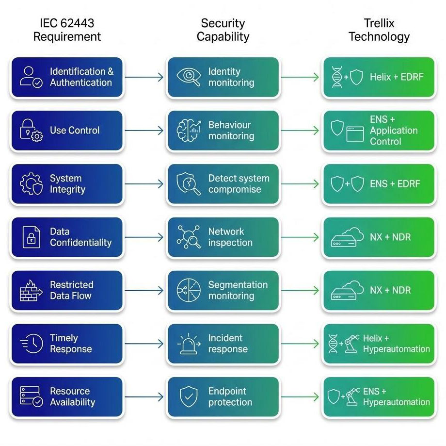 IEC 62443 defines a series of standards for securing operational technology (OT) in industrial automation and control systems. Australia has adopted this framework as AS IEC 62443 to strengthen the protection of critical infrastructure. The standard outlines foundational security requirements, but organisations must implement these through a combination of architecture, processes, and technology. Trellix solutions, alongside integrations such as Nozomi for OT visibility, support this by providing capabilities for identity and behavioural monitoring, system integrity validation, and network inspection across IT and OT environments. Solutions including ENS, EDRF, NX, NDR, Helix, and Hyperautomation help detect compromise, monitor data flows, and improve incident response while supporting system availability, forming a practical layer aligned to IEC 62443 requirements rather than full compliance.