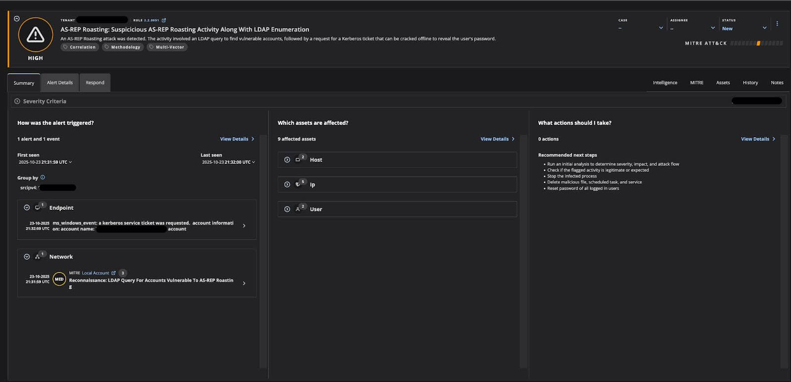 You also get a clear narrative thanks to the consolidated alert Helix provides to your team. MITRE ATT&CK mappings ( industry-standard for attacks), affected assets (which systems and users are compromised), and recommended remediation steps. By understanding the full attack chain—from initial discovery of the vulnerable account to credential extraction—your security team can stop the attack, reset the vulnerable passwords, and enable preauthentication faster, minimizing the time the attacker has inside your network.