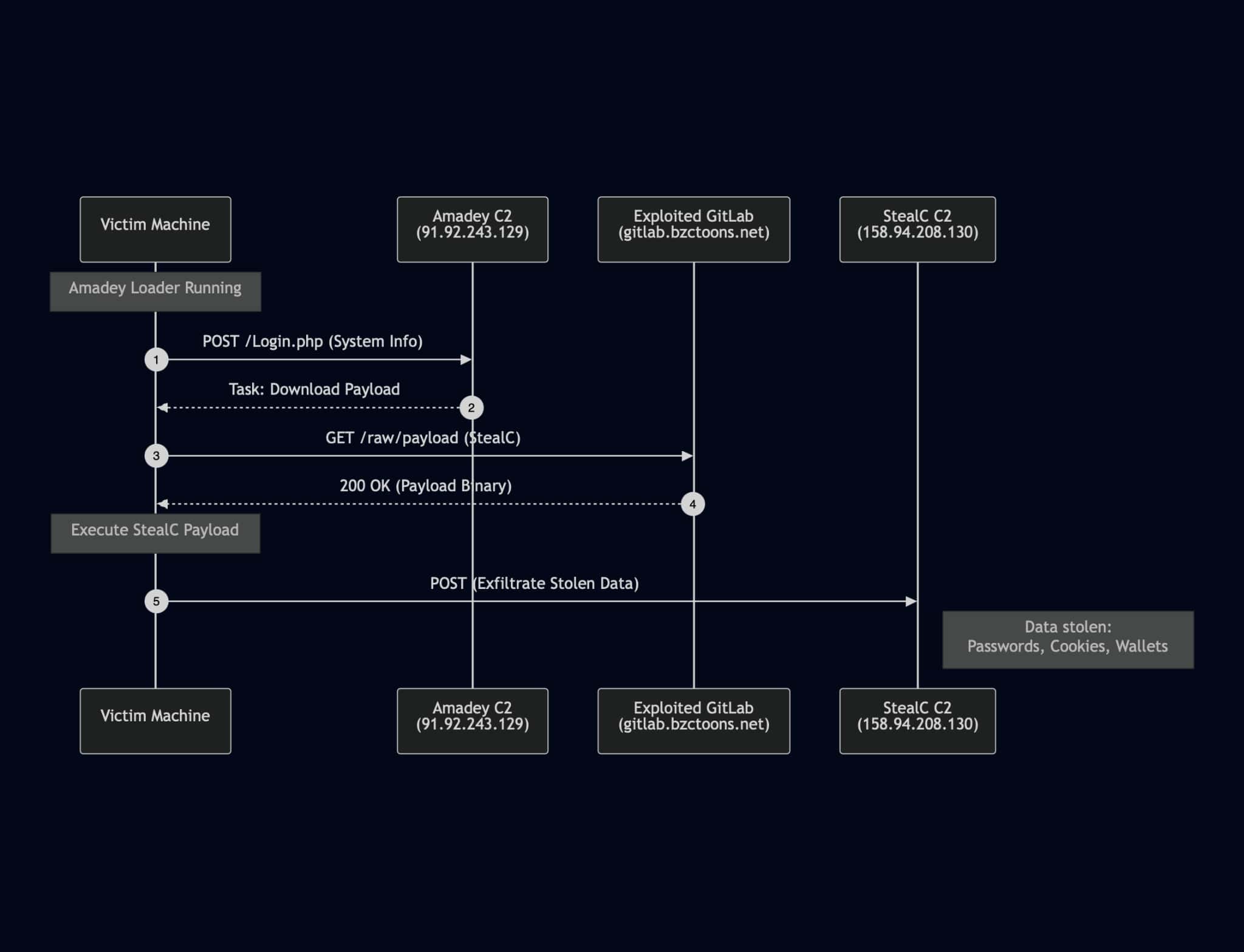Amadey is a malware loader that has been active since 2018, primarily used to distribute second-stage payloads and infostealers. While Amadey has been previously known to distribute payloads through GitHub, we recently discovered a new campaign leveraging an exploited self-hosted GitLab instance to deliver the StealC infostealer.