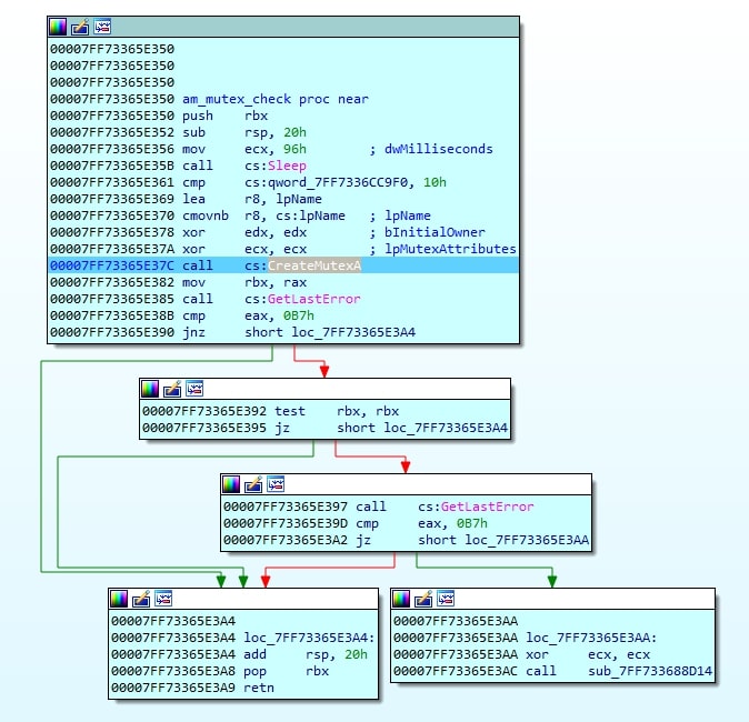 The Amadey loader (Yfgfwb.exe) first checks for an existing mutex to prevent multiple instances from running simultaneously. If no mutex exists, it creates one to ensure exclusive execution. The mutex name is stored in plain text within the .rdata section.