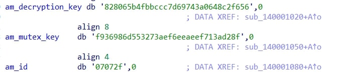 The malware stores all critical strings in the .rdata section in encrypted form. However, the mutex name, decryption key, and the Amadey botnet ID are stored in plain text within the .rdata section. The decryption key is used to decrypt all other encrypted strings.