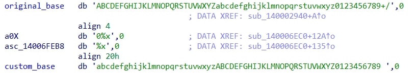The malware implements its Base64 variant by replacing the standard character set with a custom one: