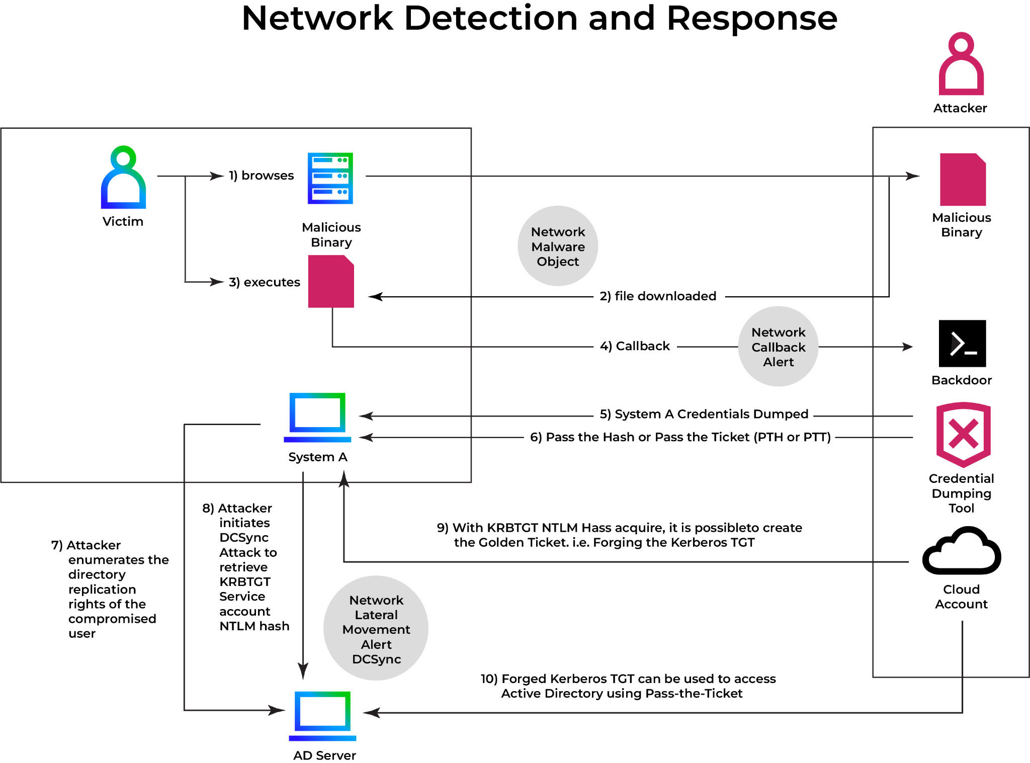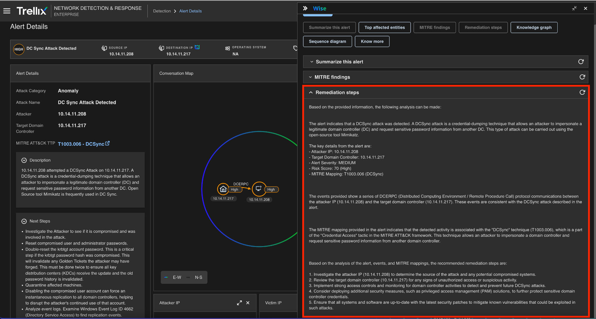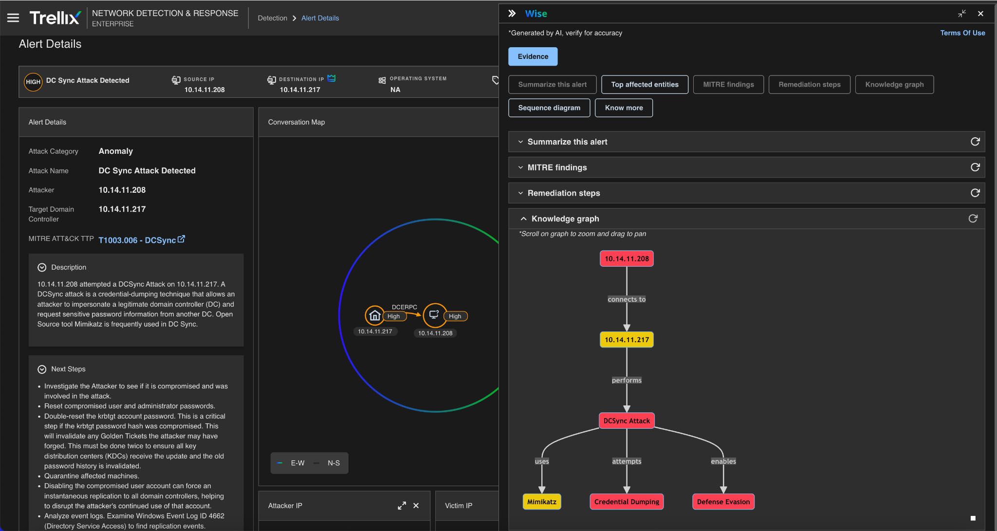 Trellix Network Detection and Response (NDR) is specifically designed to address this challenge. Trellix NDR detects DCSync activity by analyzing network traffic for behavioral anomalies such as replication requests coming from non-domain controller hosts, regardless of the attacker's toolkit. The solution enhances these detections with critical context by mapping the activity to the MITRE ATT&CK framework, providing actionable remediation steps, and visualizing the attack's entire footprint using the knowledge graph.
