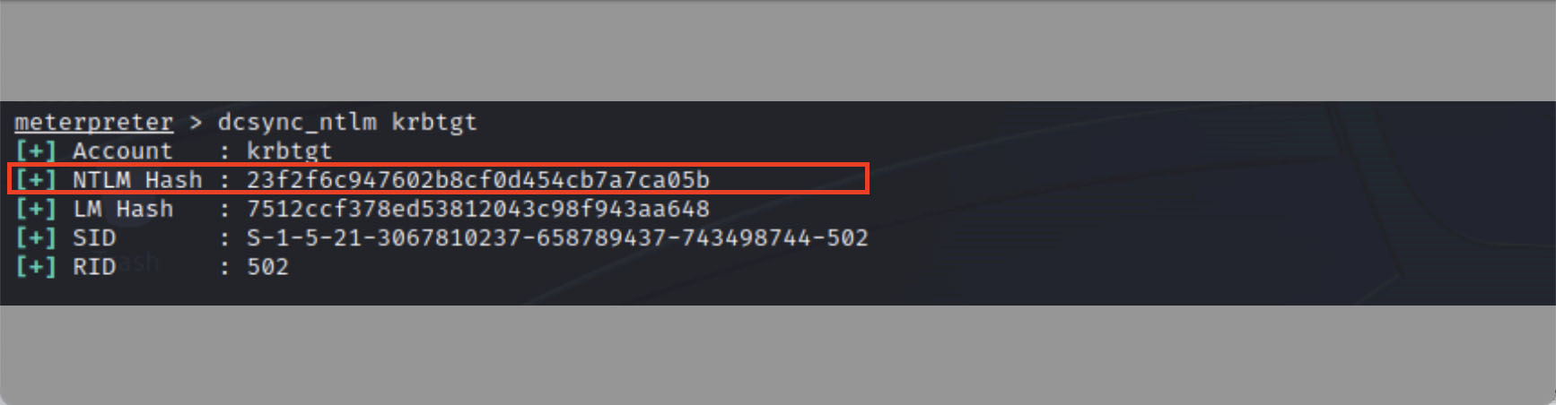 Figure 2 shows the attack's core being executed from within a Metasploit meterpreter shell. After gaining access to a machine with domain admin privileges, the attacker uses the dcsync_ntlm command to target the krbtgt account. The output shows that the account's NTLM hash was successfully extracted. This demonstrates that the DCSync technique does not rely on a single tool, such as Mimikatz, and can be initiated from a variety of attacker frameworks.