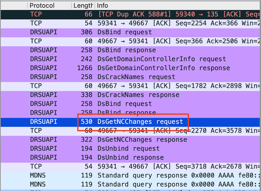 Figure 4 shows network-level evidence of the DCSync attack in progress. The Wireshark capture shows the DsGetNCChanges request, which is a valid function of the Directory Replication Service Remote Protocol (MS-DRSR). In this case, however, the request is malicious if it comes from a non-domain controller. It is the technical fingerprint of an unauthorized system impersonating a domain controller in order to trick the legitimate DC into synchronizing sensitive credential data. This is the specific behavior that technique-based detection systems seek.