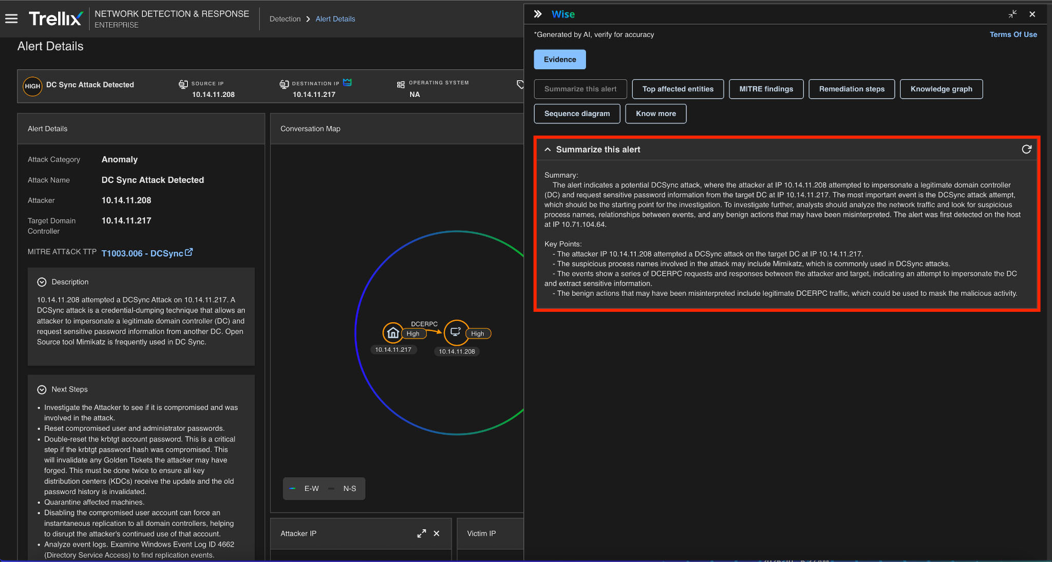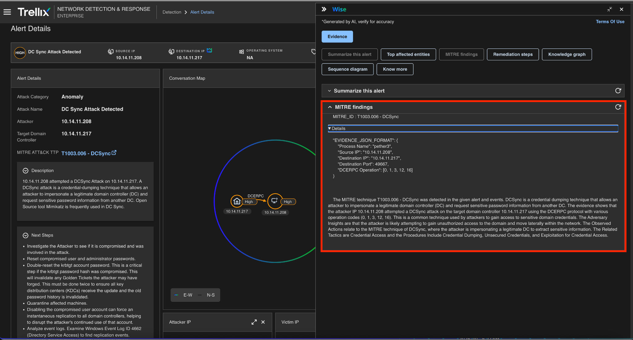Trellix NDR uses Trellix Wise, to accelerate incident response (Figure 6). When the threat is detected, the system automatically generates a plain-language summary of the attack, explaining that a DCSync attack was detected between specific hosts, with suspicious DCE/RPC traffic as the underlying cause. This enables a SOC analyst to quickly understand the context of the alert without extensive manual investigation.