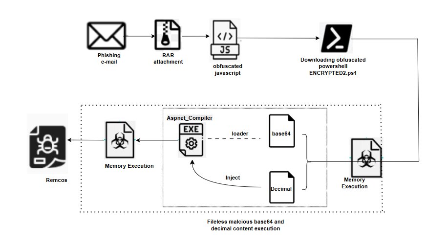 A multi-stage fileless Remcos RAT infection chain was observed leveraging procurement-themed phishing emails for initial access. The campaign delivers an archived attachment containing a JavaScript downloader that retrieves an AES-obfuscated PowerShell payload from attacker-controlled infrastructure.