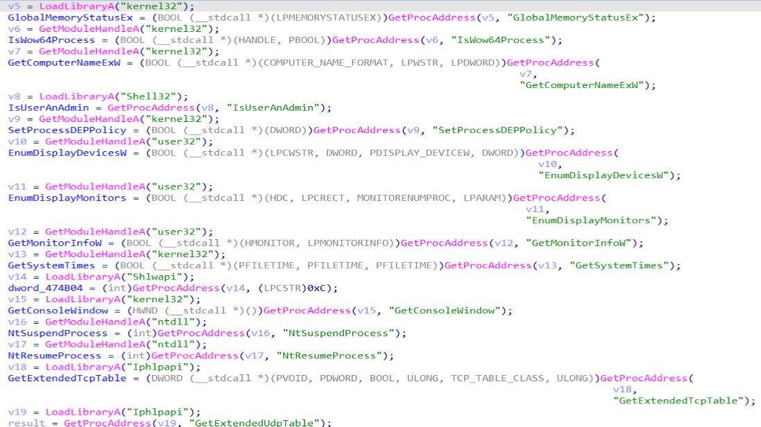 This function prepares the execution environment by loading the necessary system libraries and retrieving function pointers at runtime, ensuring the malware can operate reliably across different Windows versions while minimizing its static import footprint.