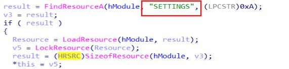 After this, it will decrypt its configuration file from the suspicious resource data “SETTINGS”.