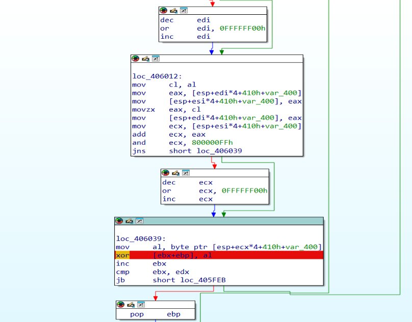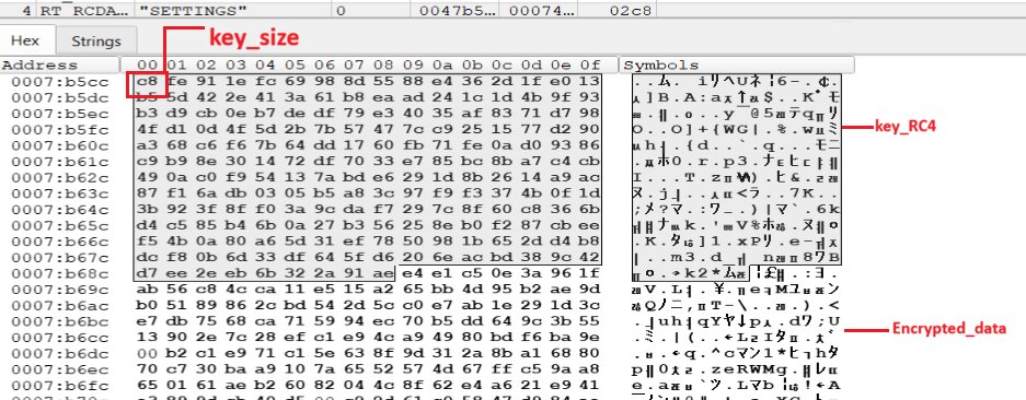 After finding the resource, it decrypts the content. The figure below shows the resource of size 0x2c8, where the key size is 0xc8, RC4 key, and the encrypted data is of size 0x200.