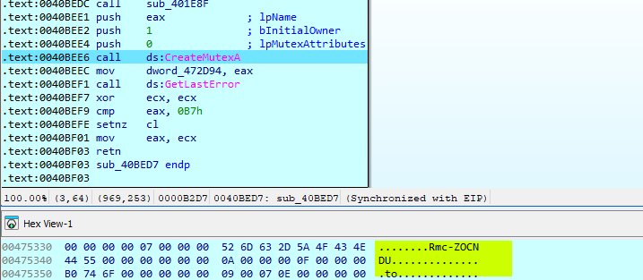 Following runtime preparation, dynamic API resolution, and config file extraction, the Remcos RAT payload performs an early execution control check to enforce single-instance operation. This is implemented by creating a uniquely named mutex, Rmc-ZOCNDU, derived from the embedded configuration.