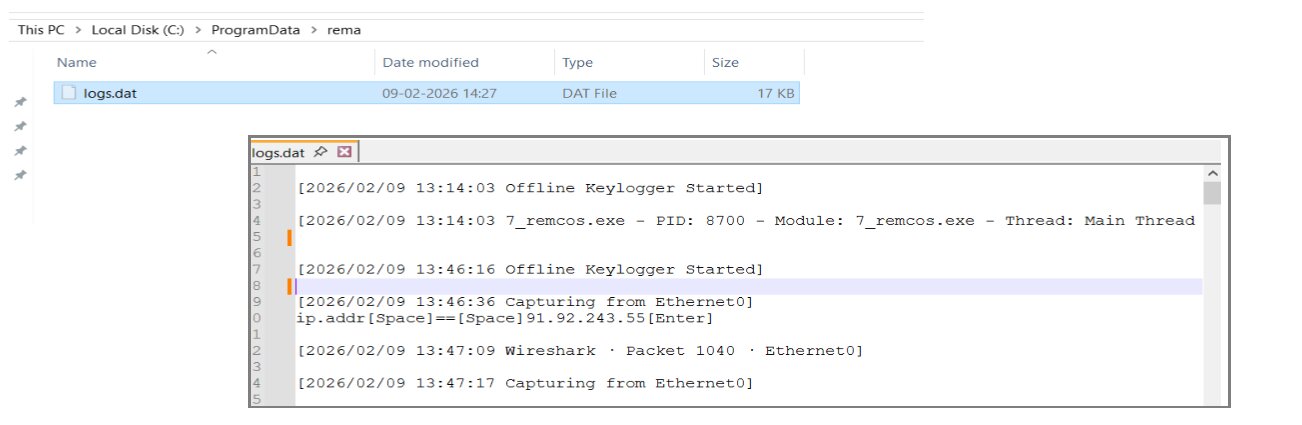 Prior to establishing C2 communication, Remcos RAT creates a local log file at C:\ProgramData\rema\logs.dat to persist runtime events and store collected data. This file is used as a temporary storage mechanism for offline surveillance output, particularly when immediate network exfiltration is unavailable.