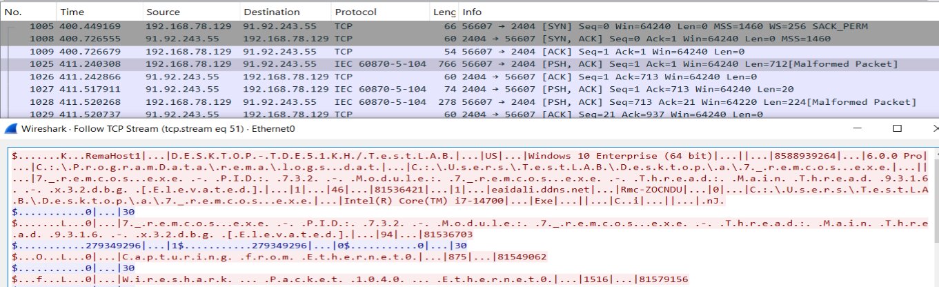 The beacon also discloses the local log file path, C:\ProgramData\rema\logs.dat, and basic hardware details, such as the CPU model. Although the traffic appears malformed when interpreted as IEC 60870-5-104, it represents Remcos RAT custom, delimiter-based C2 protocol transmitted over raw TCP.