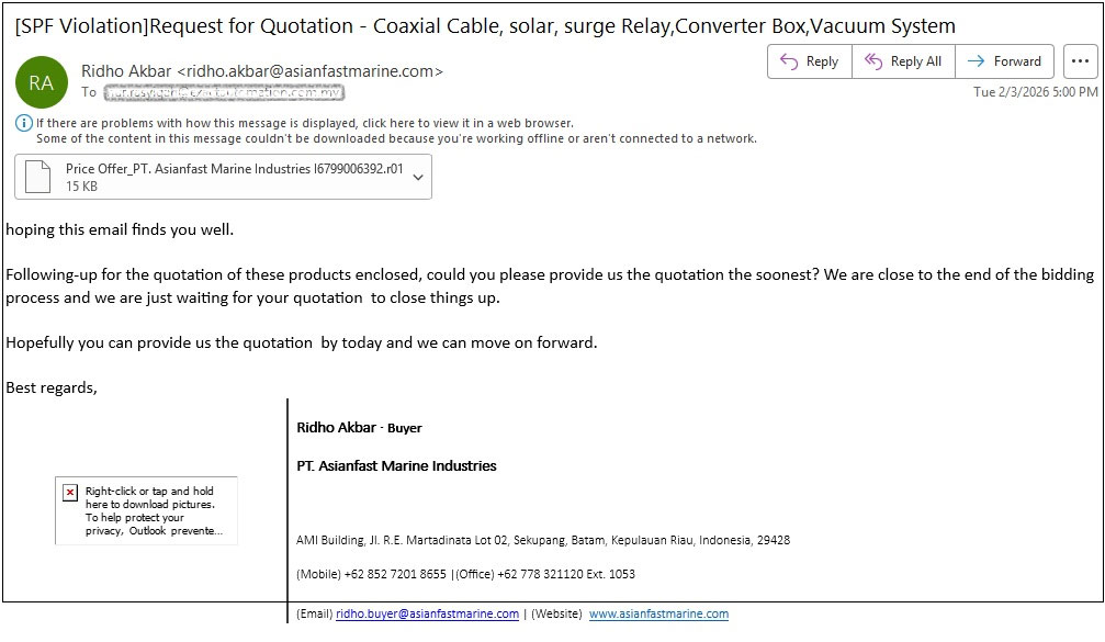 The infection chain begins with procurement-themed spam emails using generic request-for-quotation (RFQ) lures to impersonate legitimate business communications. The sender identity is spoofed to resemble a marine and industrial company, with subject lines often indicating SPF violations.