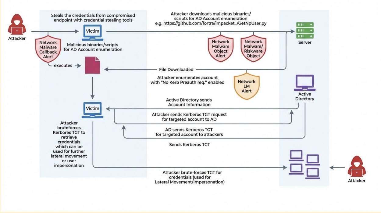 - Behavioral pattern analysis examining Kerberos authentication request characteristics Identification of TGT request patterns targeting accounts with preauthentication disabled Multi-source telemetry fusion combining endpoint detection data with network traffic analysis