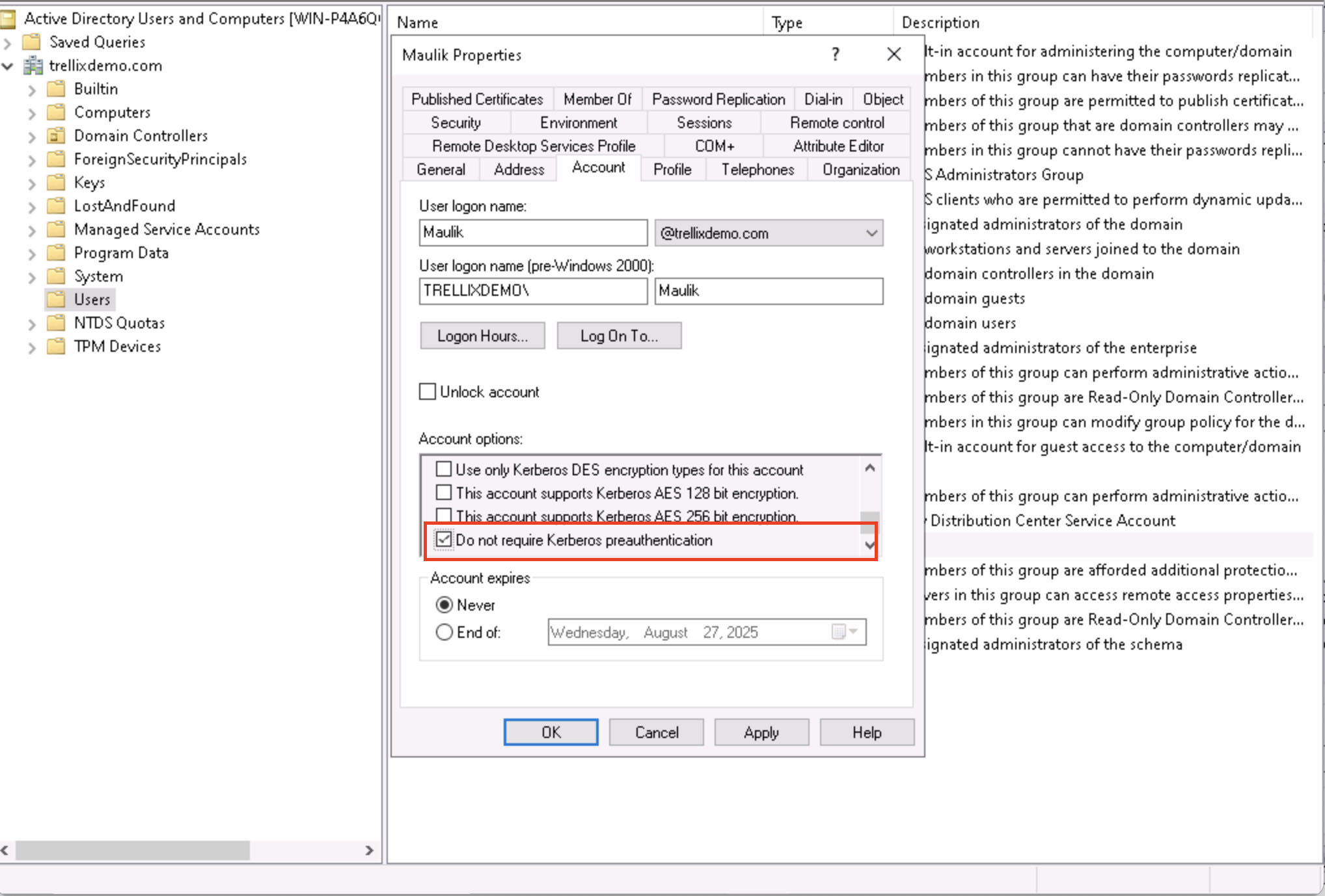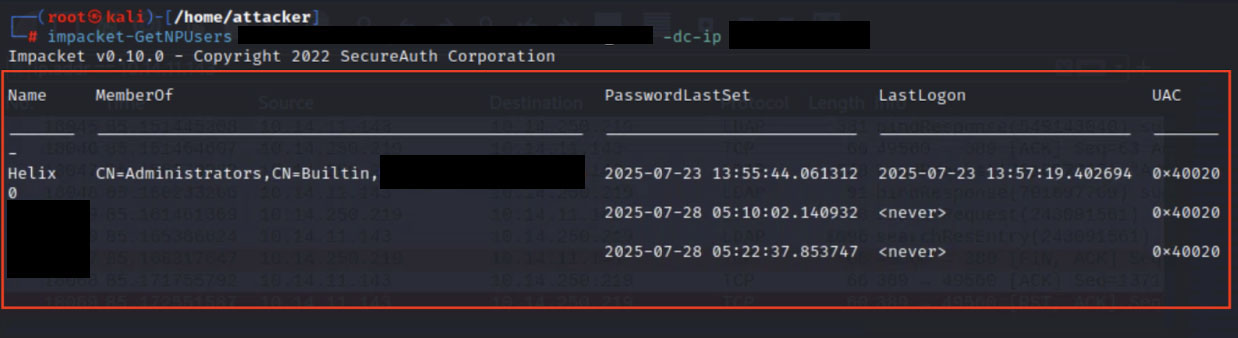 As you can see in the image above, accounts are configured in Active Directory with the "Do not require Kerberos preauthentication" setting. This configuration represents a critical security gap that allows the Key Distribution Center (KDC) to issue AS-REP responses containing password-encrypted data without identity verification. This opens the door for attackers to then perform offline cryptographic attacks.