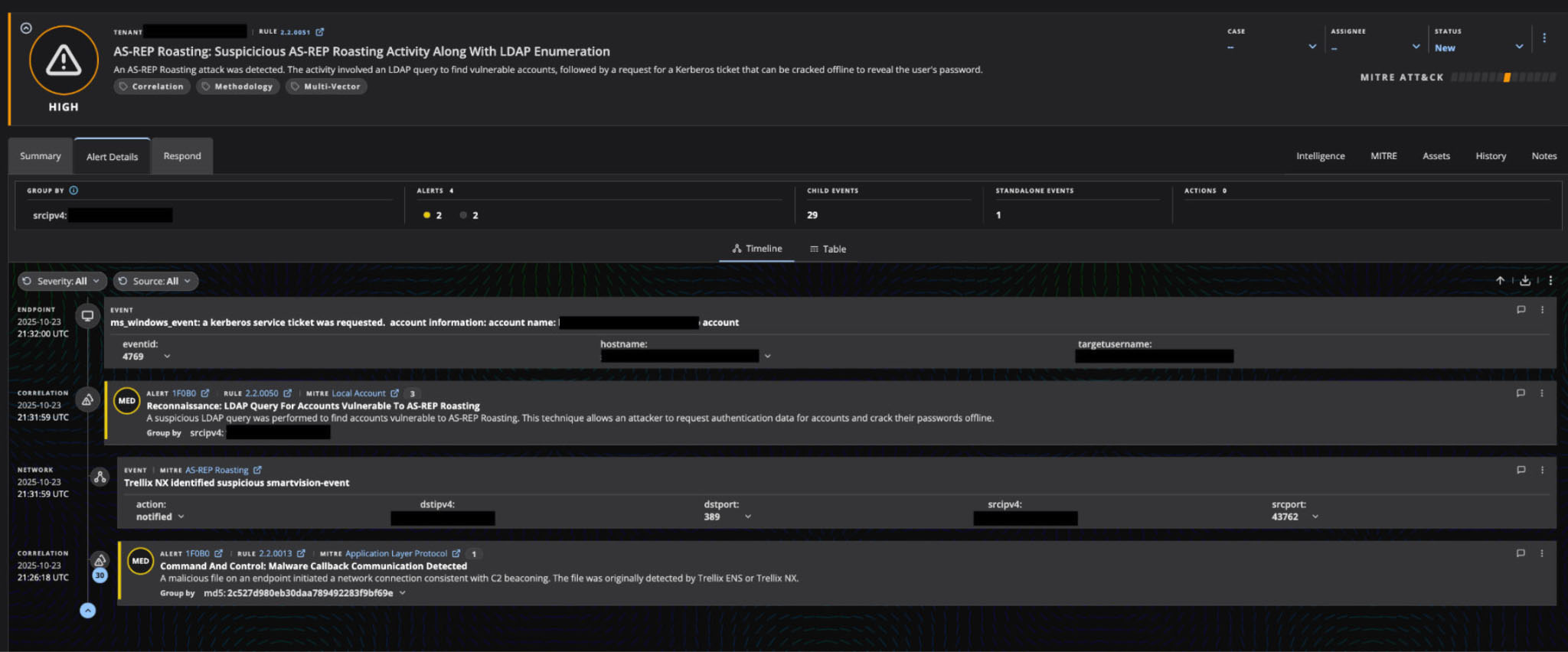 - Network Detection: Flagged through Trellix network telemetry with a MITRE-tagged alert for "Reconnaissance: LDAP Query For Accounts Vulnerable To AS-REP Roasting." This network-level detection identifies the preliminary reconnaissance phase, during which the adversary enumerated accounts with preauthentication disabled.