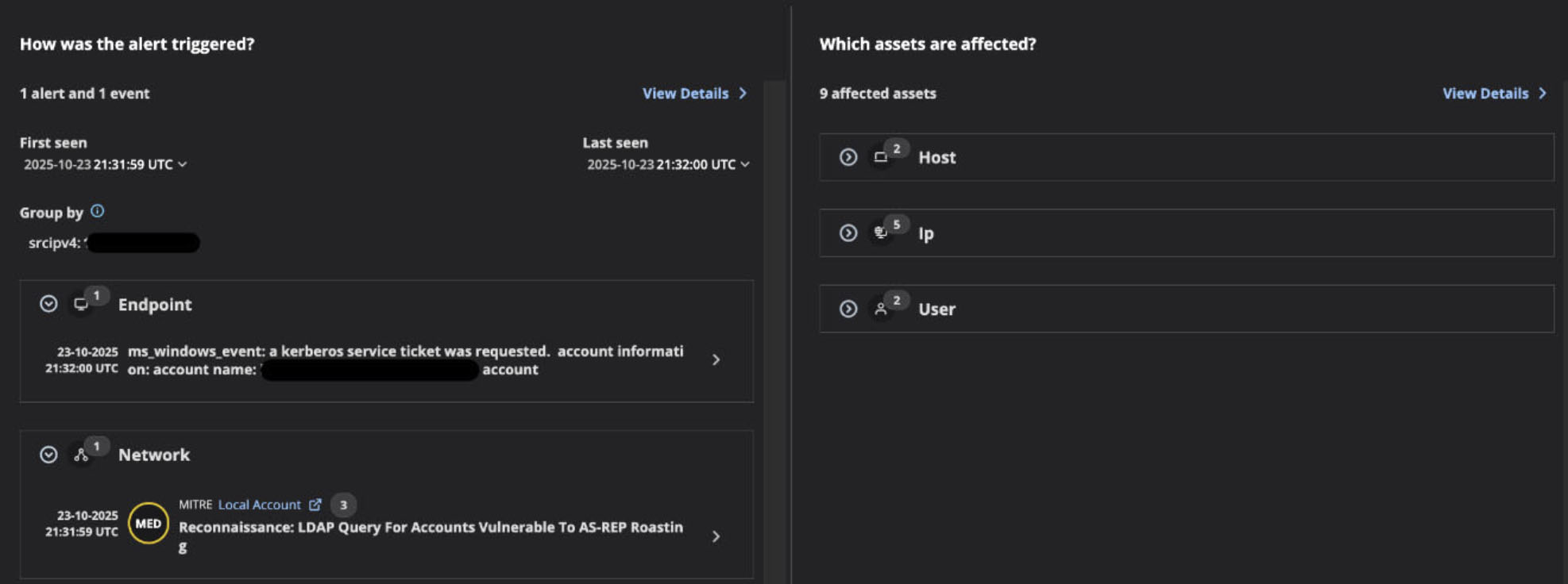 - Endpoint Detection: Captured through Windows event monitoring, specifically identifying "a Kerberos service ticket was requested" along with detailed account information. This endpoint-level visibility provides insight into the Kerberos AS-REP response being delivered to the adversary.