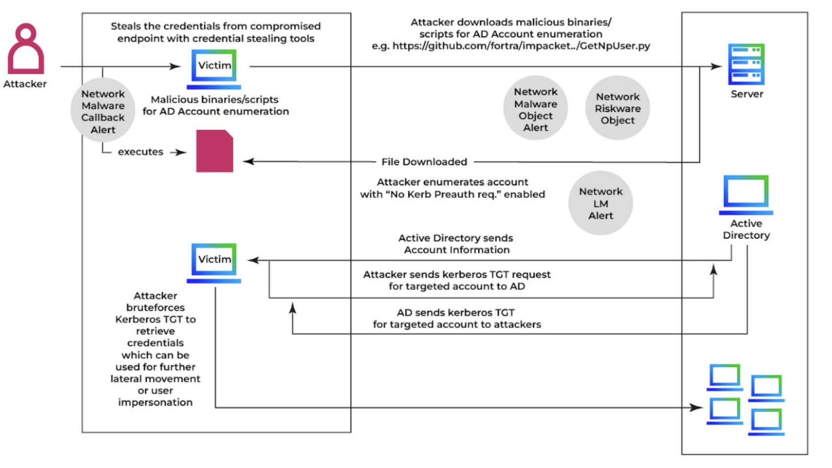 - Kerberos service ticket requests for accounts with disabled preauthentication