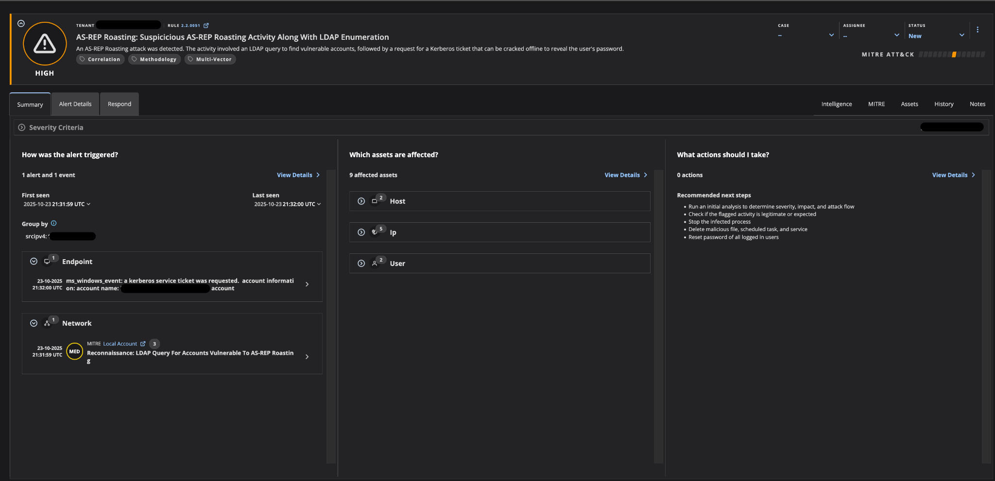 The alert is classified as HIGH severity and titled "AS-REP Roasting: Suspicious