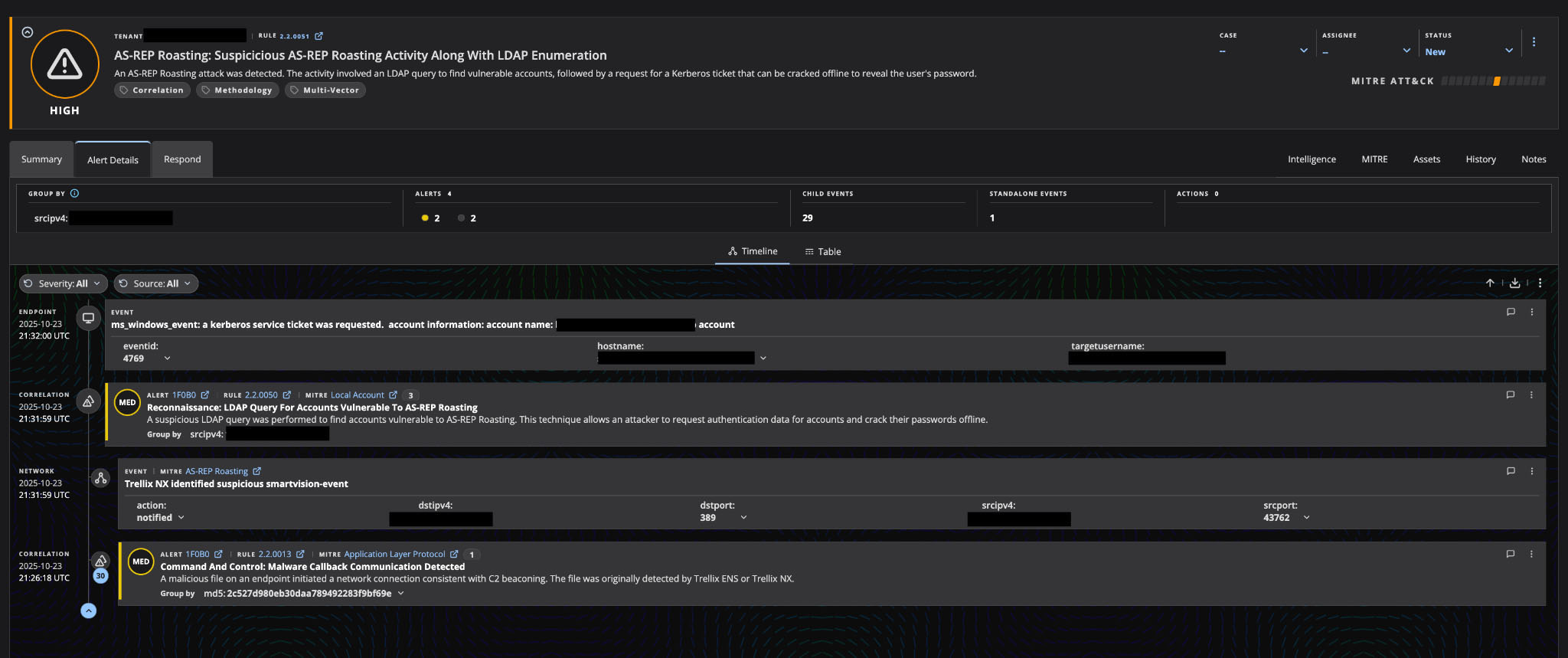 Figure 3 presents the Alert Details timeline view, which chronologically sequences the attack events to reveal the full kill chain of the AS-REP Roasting attempt. This temporal visualization is critical for understanding how the attack unfolded across different security telemetry sources. The timeline shows the attack generated atomic and correlated alerts with multiple child events, demonstrating the comprehensive visibility Trellix Helix provides into attacker activity.