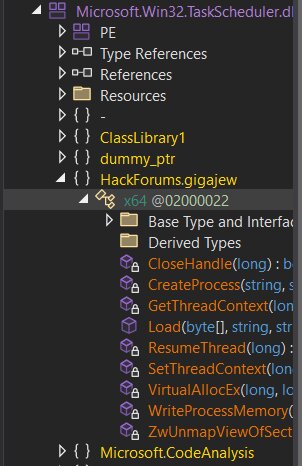 The HackForums.gigajew class is named after the HackForums user "gigajew," who originally developed the RunPE/Process Hollowing method that the class implements. This user is highly active on HackForums, frequently creating various tools for malicious software development.