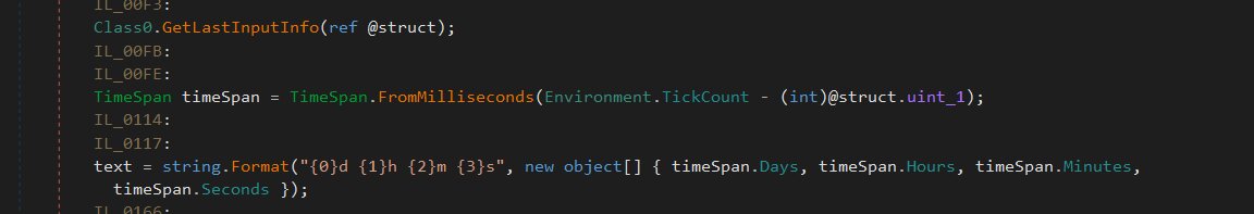Utilizing the GetLastInputInfo API, this method functions as an idle-time tracker. It calculates the duration of user inactivity and subsequently formats that time period for reporting.