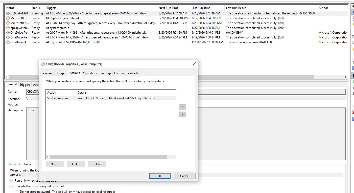 The VBScript (.vbs) file is integrated with the Windows Task Scheduler to automate the execution of its underlying scripts. These scheduled tasks are configured to trigger the script at a high frequency, specifically running every minute to ensure continuous operation or monitoring. This persistence mechanism allows the scripts to execute repeatedly without manual intervention, maintaining a constant presence on the system.