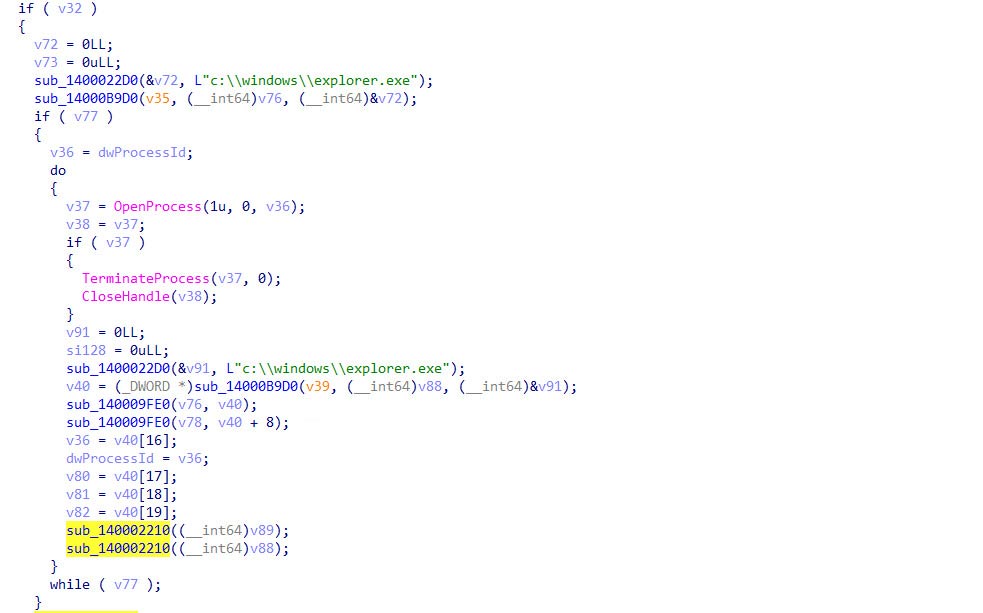 - Targeted termination: It iterates through the list, looking for specific operational components of the malware: