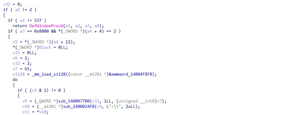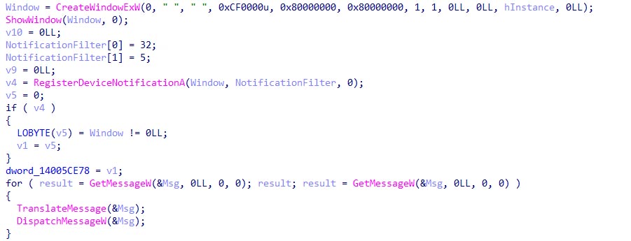 | T1120 Peripheral Device Discovery | Scans for Removable Drives (GetDriveTypeA == 2) to identify targets for the worm module. | |