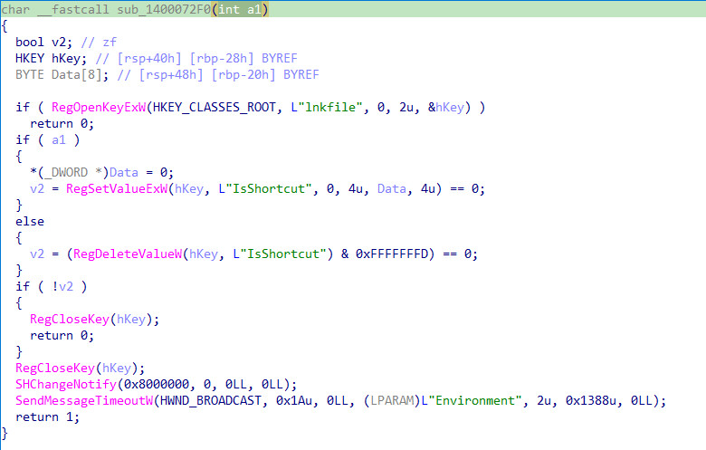 | T1112 Modify Registry | Modifies HKCR\lnkfile\IsShortcut to hide the shortcut arrow overlay, making malicious LNK files look like legitimate EXEs or documents. | |